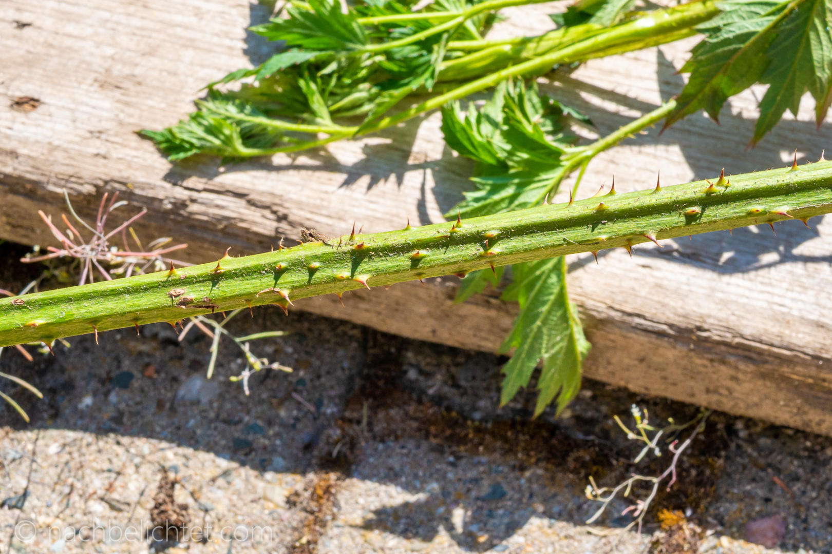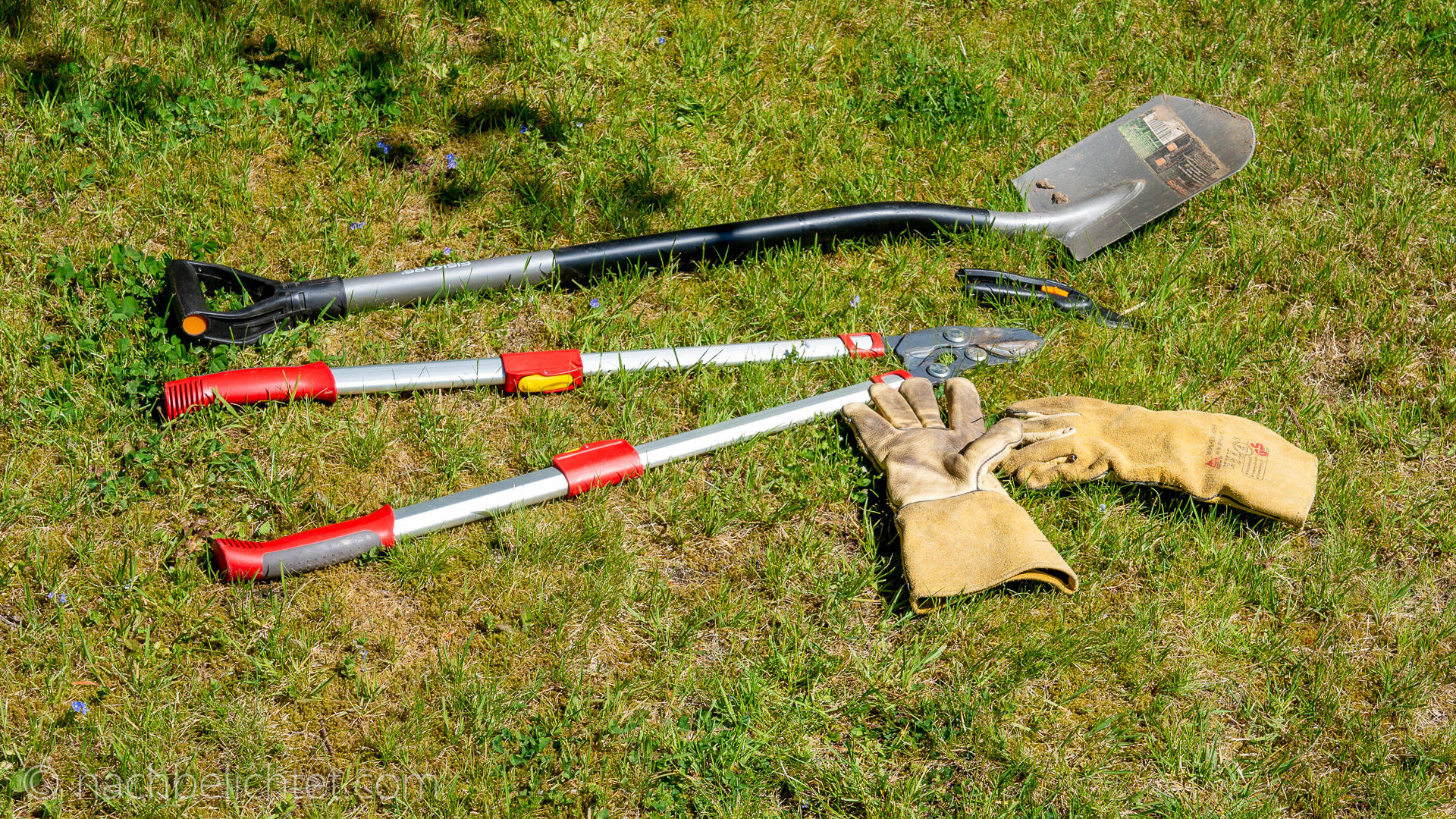 Wenn man einen eingewachsenen Garten übernimmt, hat man auch Altlasten zu bewältigen. Neben wunderschönen Rhododendren wucherten bei uns auch jede Menge Brombeersträucher. Zwar hatten wir beachtliche Brombeer-Ernten, nur nahmen die Ranken überhand und überwucherten alles. Die Stiele der Brombeere können gut und gerne 2 cm dick werden und die Dornen, nicht nur ausgewachsener Brombeersträucher, sind höchst unangenehm und gefährlich.