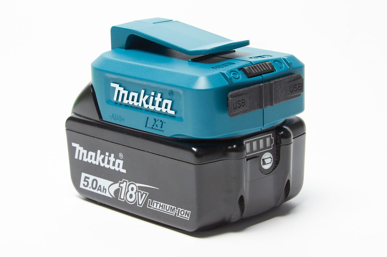 Von Makita gibt es zwei USB-Adapter für deren Werkzeugakkus, den Makita DEBADP05 für die 18 Volt Serie und den DEAADP06 für die 10,8 Volt Akkus. Beide Adapter bekommt man für jeweils etwa 15 Euro, wobei die 18 Volt Variante stark im Preis schwankt.
