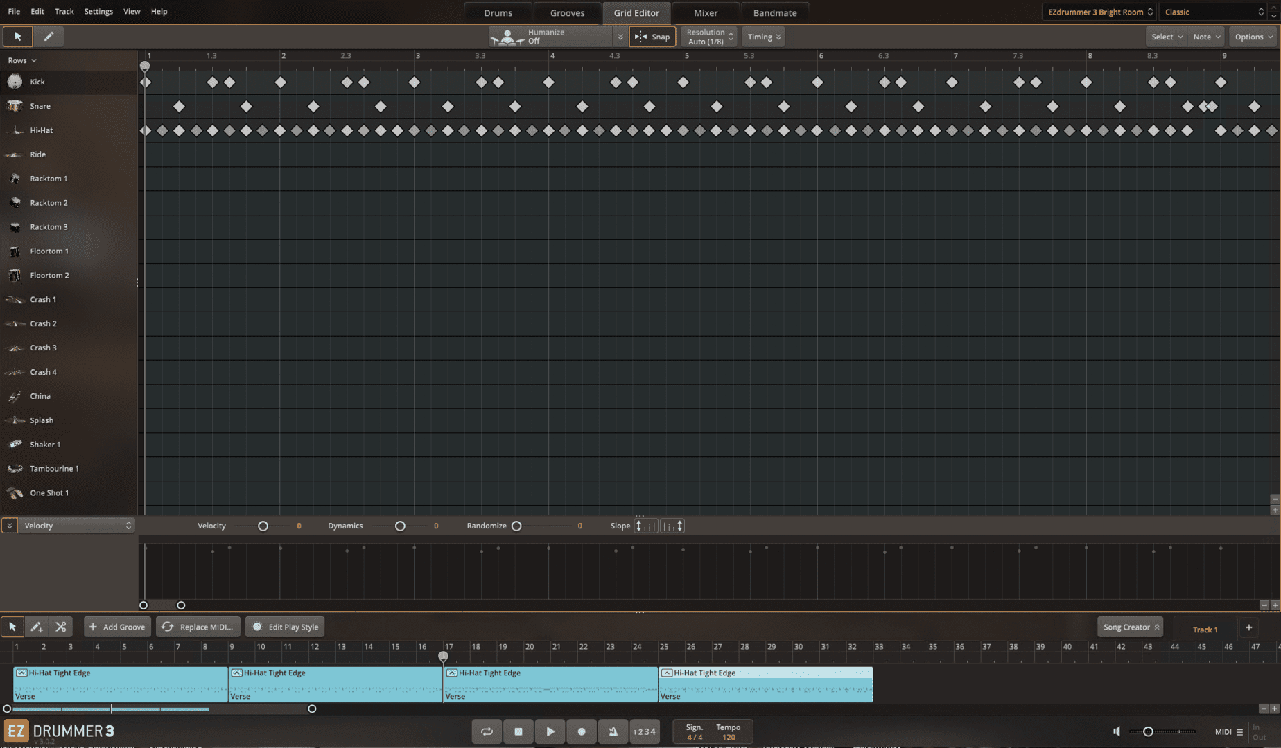 Apropos verfeinern: Im integrierten Grid-Editor lassen sich die Grooves direkt in EZdrummer bearbeiten, ohne dass man den Umweg über die DAW gehen müsste. Auch hier sind die Funktionen speziell auf die Bedürfnisse der Drum-Programmierung ausgelegt. Die globale Dynamik kann ebenso bearbeitet werden, wie zufällige Timings. Auch ob die Drums eher laid back oder „pushy“ gespielt werden sollen, kann hier viel einfacher festgelegt werden, als im MIDI Grid der DAW.