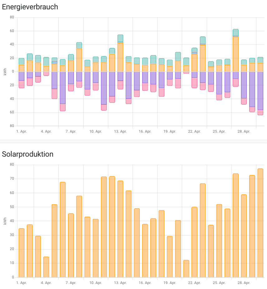 - 172 kWh entfielen auf das Laden des E-Autos, das im April zu 100 % mit PV-Strom geladen wurde.