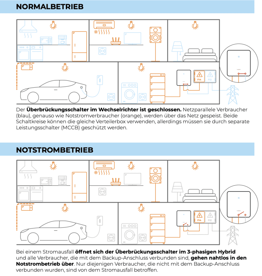 Wie schon erwähnt, beherrscht der Sungrow SH10RT einen automatischen, 3-phasigen Notstrombetrieb mit maximal 3 kVA Schieflast. Für den Notstrombetrieb ist hier auch kein externer Netztrennschalter notwendig. Wir haben ihn trotzdem installiert, denn sollte der Wechselrichter einmal defekt sein, würden alle Verbraucher, die am Backup-Ausgang hängen, nicht mehr mit Strom versorgt werden. Durch den Netztrennschalter kann man diese Lasten überbrücken und damit den Wechselrichter umgehen.