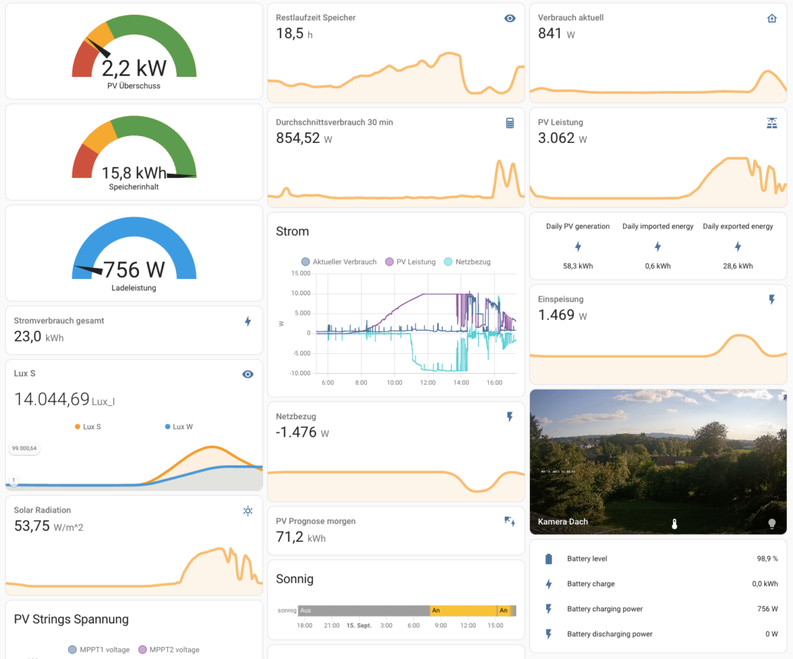 Natürlich wird es in den Wintermonaten schwer werden, die 16 kWh zu füllen und ob sich ein Batteriespeicher rechnet, muss jeder für sich selbst entscheiden. Aktuell decken wir unseren Verbrauch aber zu 100 % selbst und ohne Netzbezug. Da wir, durch Homeoffice, Server etc. einen recht hohen Stromverbrauch haben, macht das schon Laune.