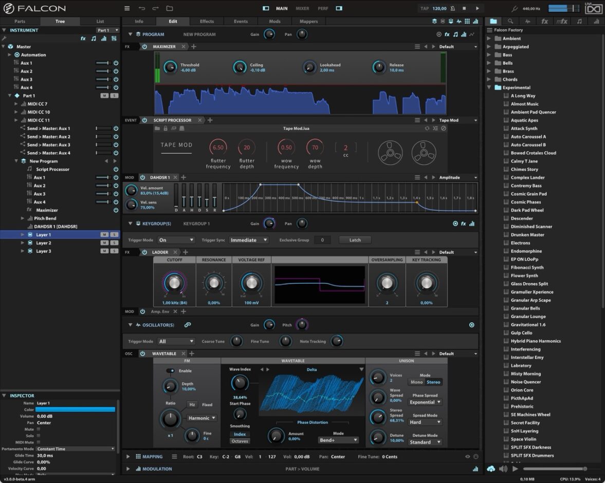 Falcon 3 ist eine Hybrid-Workstation, die verschiedene Syntheseformen, Sampling, Modulation und Effekte in einer leistungsstarken und flexiblen Umgebung vereint. Mit Falcon 3 könnt ihr euren Sound aufwerten, indem ihr aus einer riesigen Auswahl an Oszillatoren, Filtern, Effekten und Skripten wählt, die alle in Echtzeit gesteuert und manipuliert werden können.