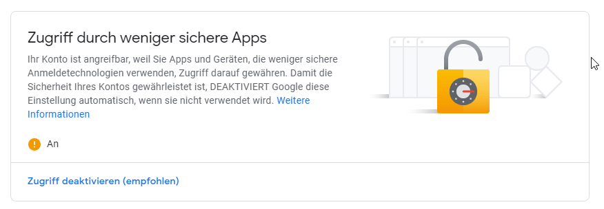 Der Versand erfolgt über den SMTP-Server von Gmail. Dazu muss in den Einstellungen von Gmail unter Sicherheit der „Zugriff für weniger sichere Apps“ aktiviert werden, da man sonst den SMTP nicht für externe Anwendungen nutzen kann.