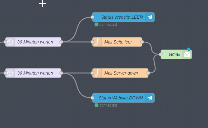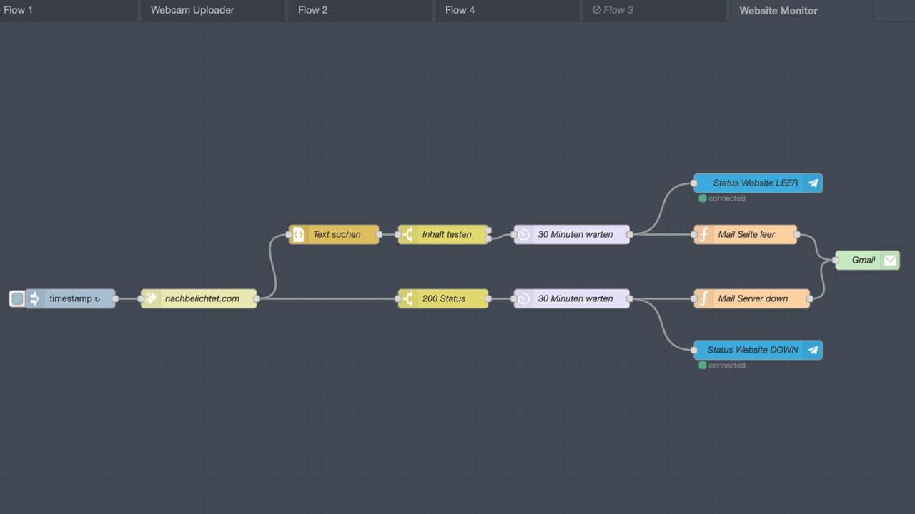 Node-Red ist ja mein neues Universal-Werkzeug für alle möglichen Automationsprobleme und Aufgaben. Warum also nicht eine Überwachung für den Webserver und die eigene Website damit realisieren, die im Fehlerfall, also Website down oder ohne Inhalte per Telegram und E-Mail informiert?