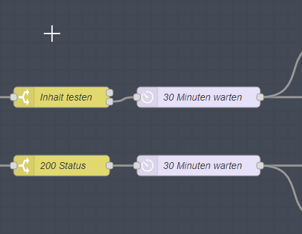 Nun könnte man an jeden Zweig eine entsprechende Aktion, Benachrichtigung etc. anhängen. Allerdings würde im Fehlerfall diese Aktion oder Nachricht alle 5 Minuten gesendet werden, da ja der Injection-Node am Anfang alle 5 Minuten den Flow ausführt. Daher habe ich in jeden Zweig eine Delay-Node eingefügt.
