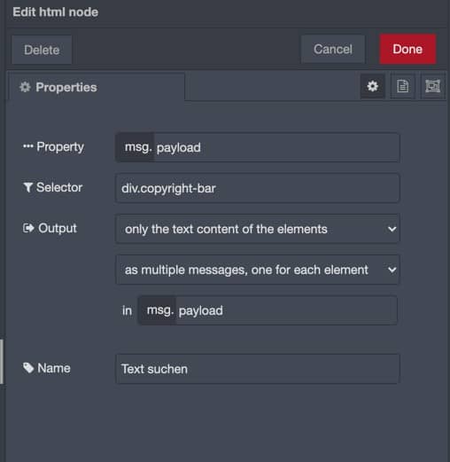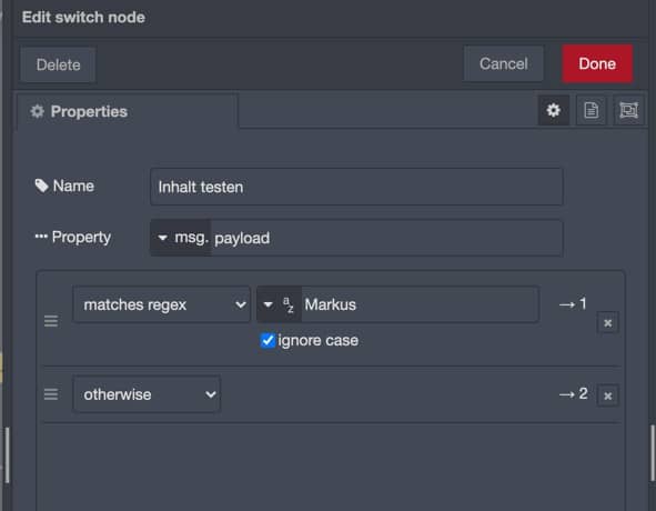 Wird der Text im HTML-Element gefunden, wird dessen gesamter Textinhalt als Payload zurückgegeben. Der nachfolgenden Switch-Node prüft mit einem regulären Ausdruck, der hier extrem einfach ausfallen kann, ob auch Markus im Text enthalten ist.