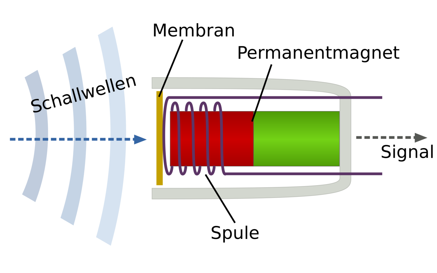 Beim Tauchspulenmikrofon wird einfach eine Spule mit Kupferdraht an die Membran geklebt und diese Spule bewegt sich in einem Magneten. Trifft Schall auf die Membran, taucht die Spule in den Magneten ein und deshalb nennt man dieses Prinzip Tauchspulenmikrofon oder auch „dynamisches Mikrofon„. Dabei entsteht durch Induktion eine ganz kleine Spannung, die in der Höhe dem Verlauf der Luftdruckschwankung folgt.