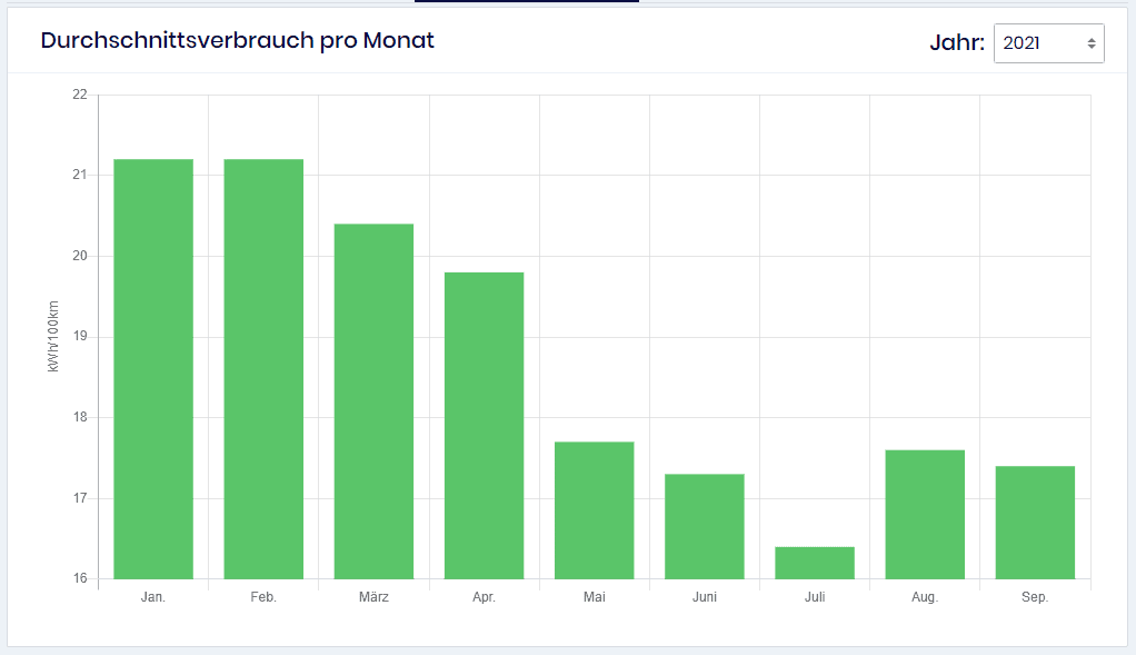 Von Februar 2021 bis heute komme ich hier auf einen Durchschnittsverbrauch von 18,6 kWh pro 100 km. Dabei steigt der Verbrauch im strengen oberfränkischen Winter auf 22 kWh und nimmt in diesem Zeitraum einen Großteil des Verbrauchs ein. Bei niedrigen Temperaturen ist der Akku weniger effizient und Heizung, Sitzheizung und Scheinwerfer benötigen zusätzlich Energie.