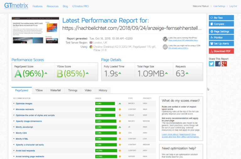 Sehr viel mehr in die Tiefe geht GTMetrix. Mit einem kostenlosen Account kann man zusätzlich andere Serverstandorte für den Vergleich auswählen und aktuelle Messungen mit früheren Analysen vergleichen. GTMetrix zieht euch bei der YSlow Bewertung übrigens immer gleich einige Punkte ab, wenn ihr kein CDN einsetzt. Warum CDNs aber nicht immer sinnvoll sind, erkläre ich weiter unten im Text.