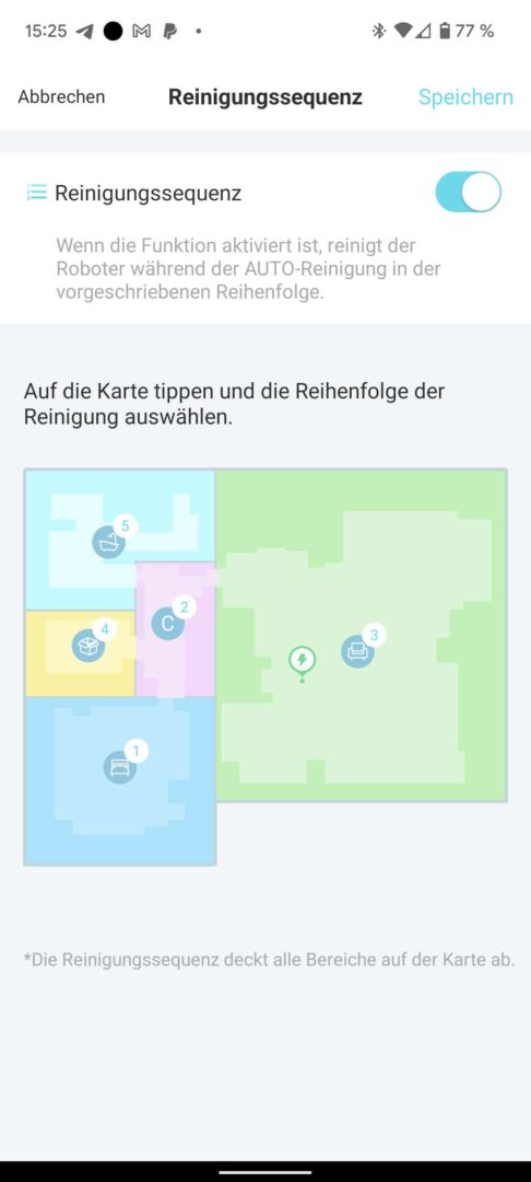 In der App können dann Zeitpläne und auch die Reihenfolge der Reinigung festgelegt werden. Man findet Statistiken zur Reinigung, Einstellung der Saugkraft usw. Für Teppichböden kann eine automatische Erhöhung der Saugkraft aktiviert werden.