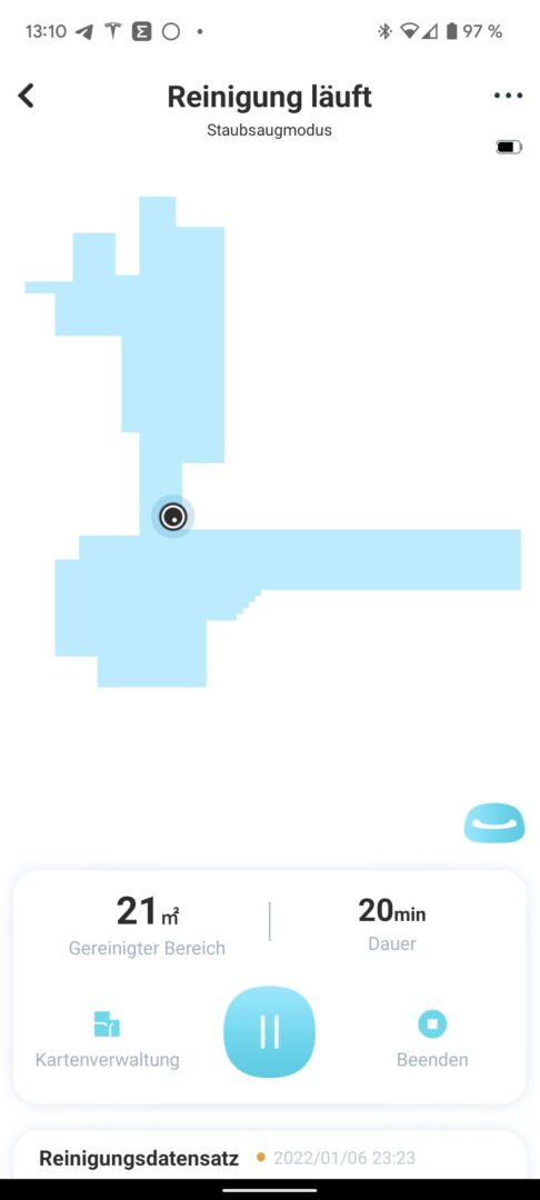 Damit der Yeedi eine Karte anlegen kann, muss er einmal ohne Unterbrechung seine Umgebung erfassen können. Das funktioniert ordentlich, allerdings erkennt man sofort, dass die Auflösung, mit der er seine Umgebung abtastet, sehr viel geringer ist, als bei Geräten mit Lasernavigation. Die Genauigkeit der Karten und damit der Navigation nimmt nach weiteren Reinigungsvorgängen zu, und ich würde sagen, dass er ab drei vollständigen Durchläufen eine recht gute Karte erzeugt hat.