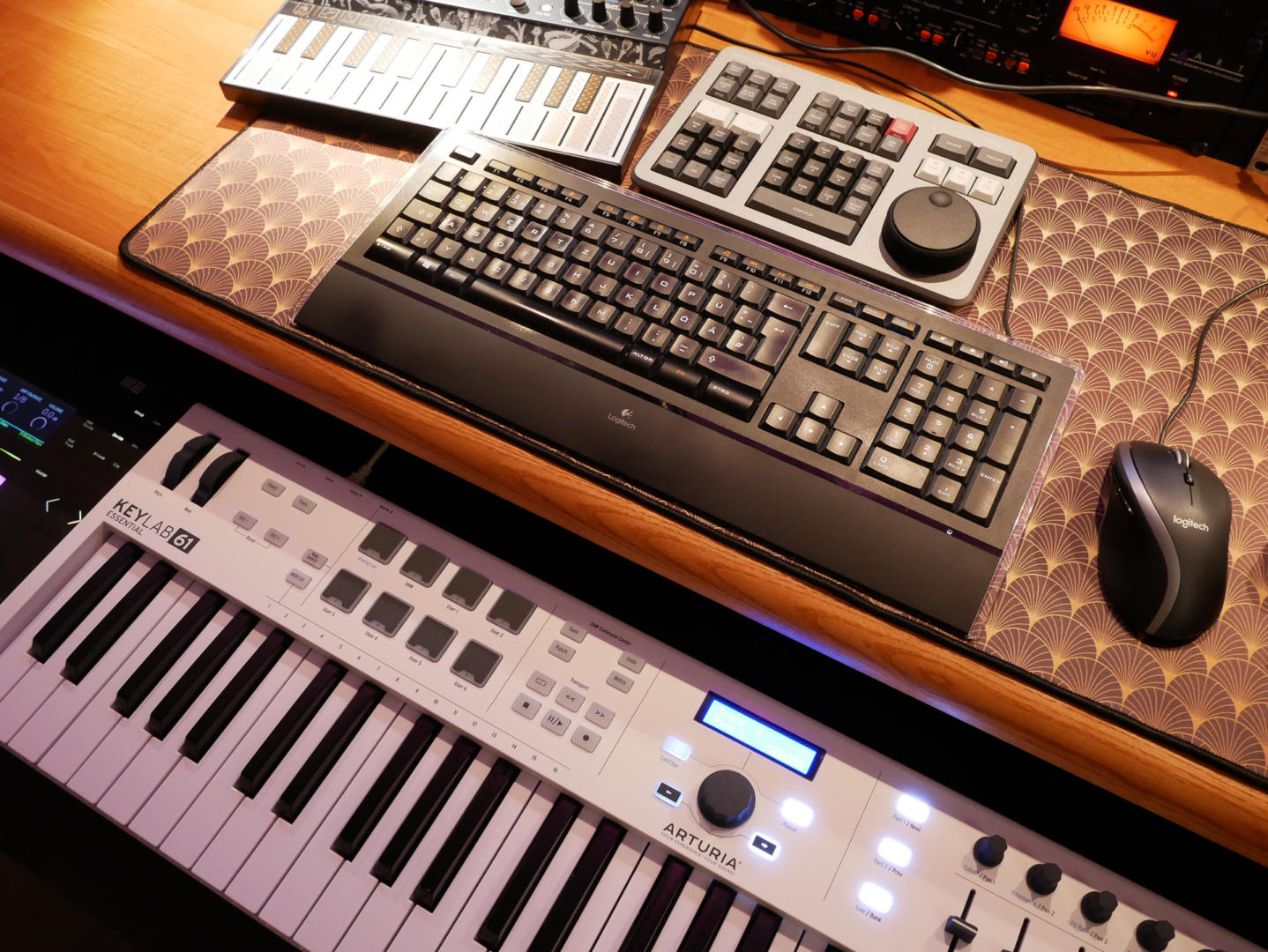 Mittlerweile habe ich schon viele Stunden am neuen Zaor Tisch verbracht. Meine Konfiguration hat mir auf Anhieb gefallen und hat sich als sehr praxistauglich erwiesen. Mit einem höhenverstellbaren Drehstuhl, sitze ich für jede Aufgabe bequem und habe alles in Griffweite. Der Keyboard-Auszug ist durch die spezielle Konstruktion sehr stabil. Nichts federt nach oder rollt zurück. Die Höhe ist genau richtig – auch für die Nutzung mit einem Pad-Controller. Nun bin ich kein gelernter Keyboarder und es ist auch nicht mein Hauptinstrument. Umso wichtiger ist es hier, dass man die Tasten in optimaler Höhe und Sichtweite hat.