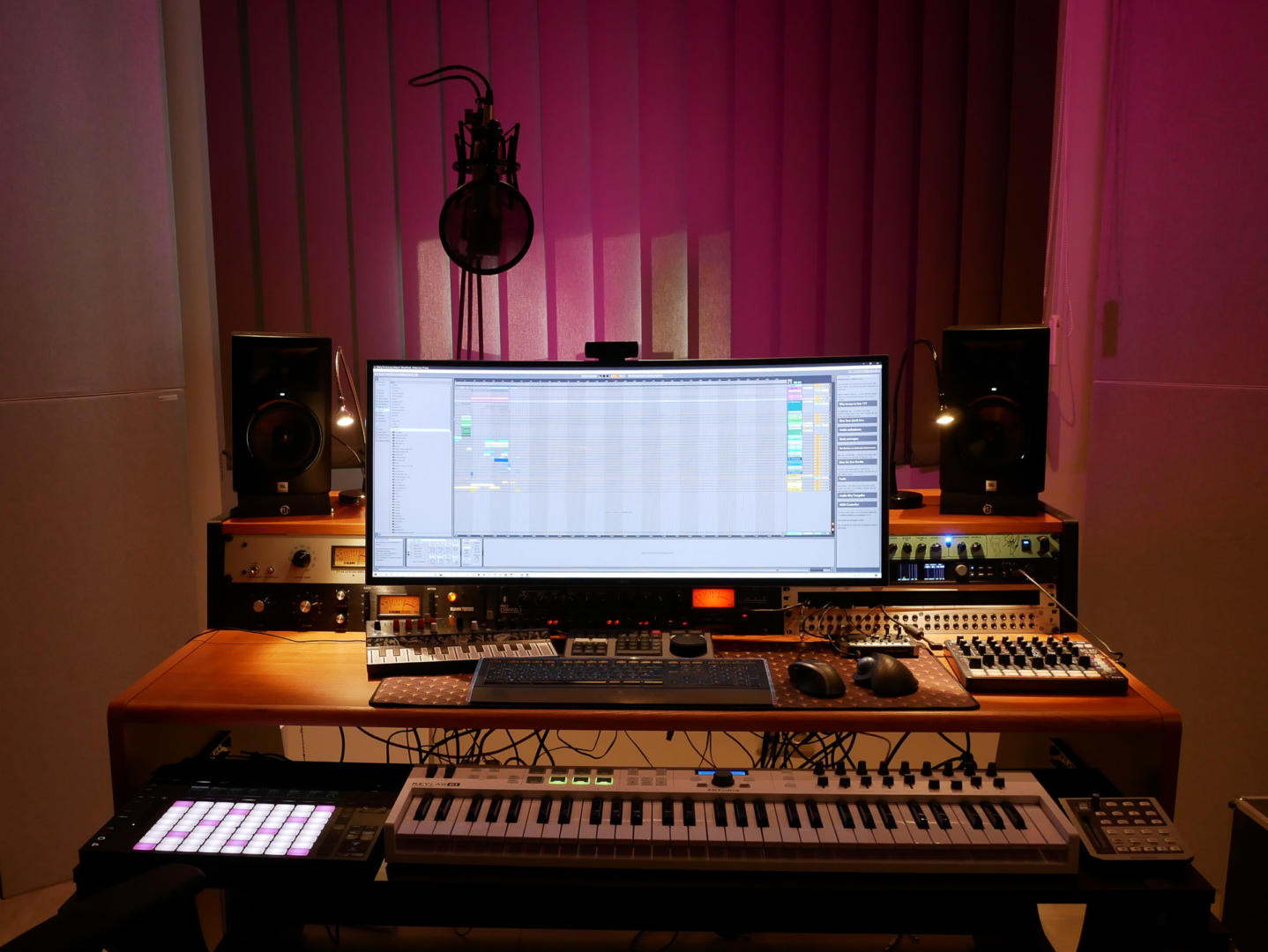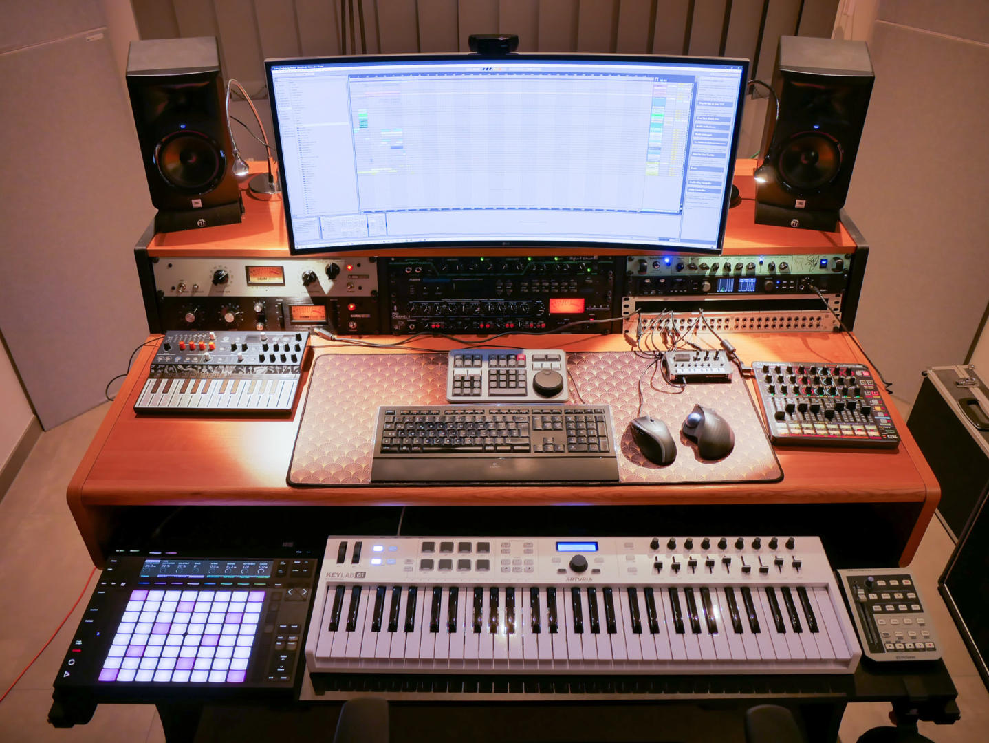 Auch ich hatte früher einfache Schreibtische so modifiziert und auch um einen Keyboard-Auszug ergänzt. Leider sind solche Lösungen meist nie ideal und der DIY-Keyboard-Auszug schwingt nach. Outboard-Equipment muss irgendwo hin, soll aber einfach erreichbar und bedienbar sein. Gerade bei Patchfeldern und Effektgeräten ist das wichtig. Die Monitore brauchen einen Platz auf Ohrhöhe und dann muss ja auch noch ein Display untergebracht werden. Hat man das erst einmal gelöst, steht das Thema Kabelmanagement im Raum.