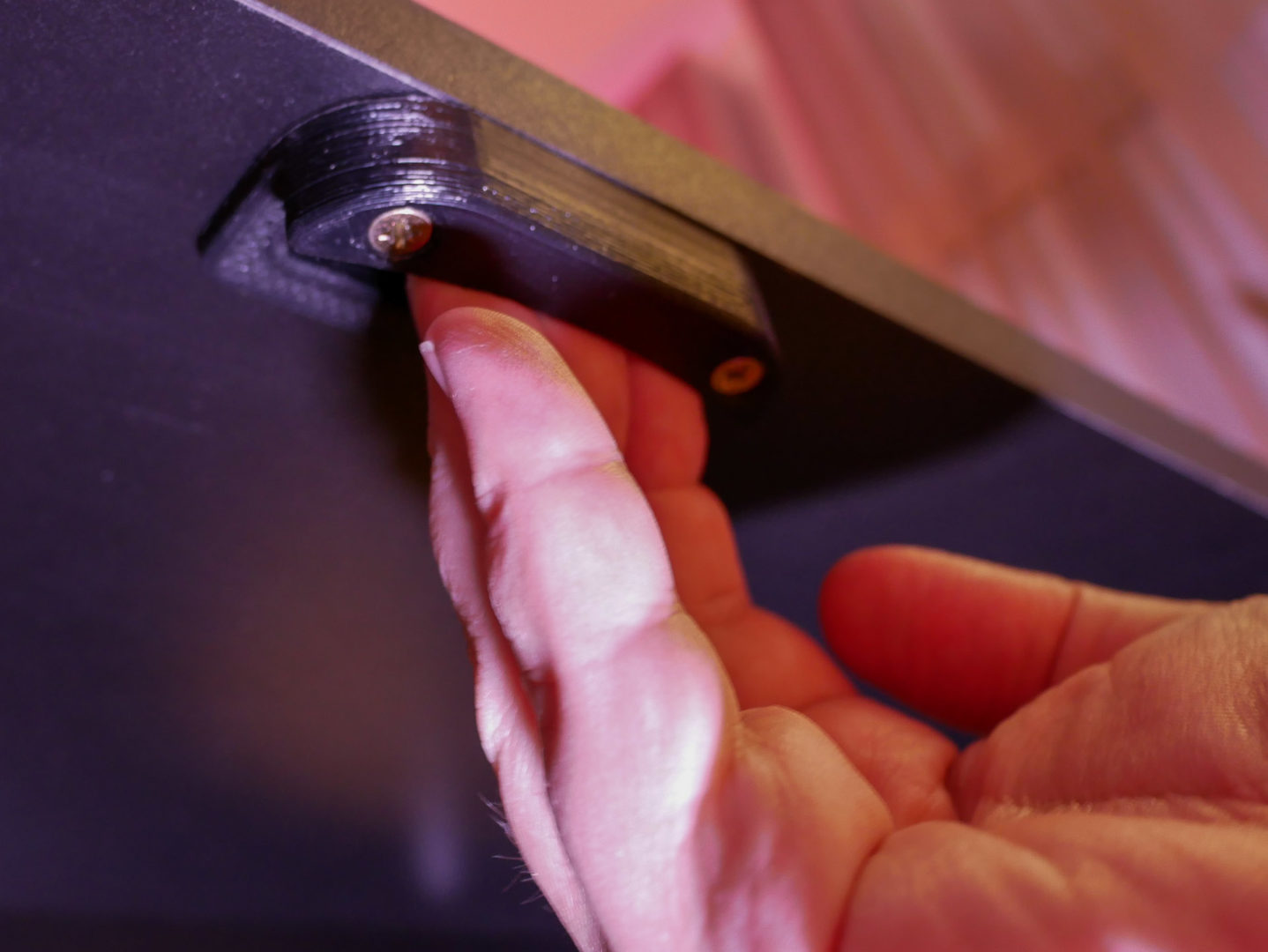 Eine kleine Modifikation habe ich aber auch hier vorgenommen: Wenn man den Auszug herausziehen möchte, muss man die Platte greifen. Je nach Gewicht der Geräte auf dem Auszug kann das schon etwas anstrengender sein, was der stabilen Bauweise geschuldet ist. Ich habe mir daher zwei Griffe konstruiert und 3D-gedruckt, die ich an der Unterseite des Auszugs geschraubt habe.