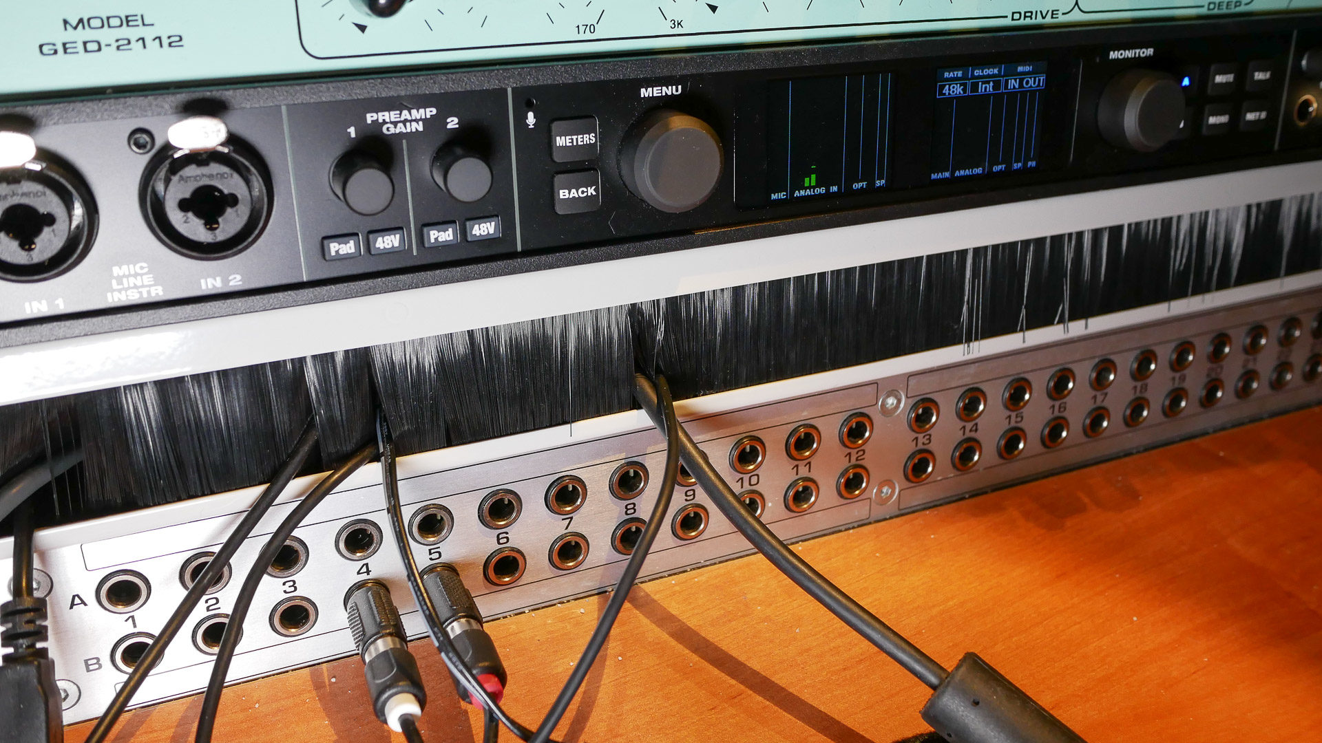 Zwischen Audiointerface und Patchfeld habe ich eine Durchführungsblende mit Bürste installiert, welche man sonst eher in Server-Racks im IT-Bereich findet. Damit können Kabel von der Tischplatte sauber zur Rückseite durchgeführt werden. Zudem komme ich durch den flexiblen Bürstenabschluss auch später noch an die Schalter auf der Oberseite der Behringer PX3000 Patchbay.