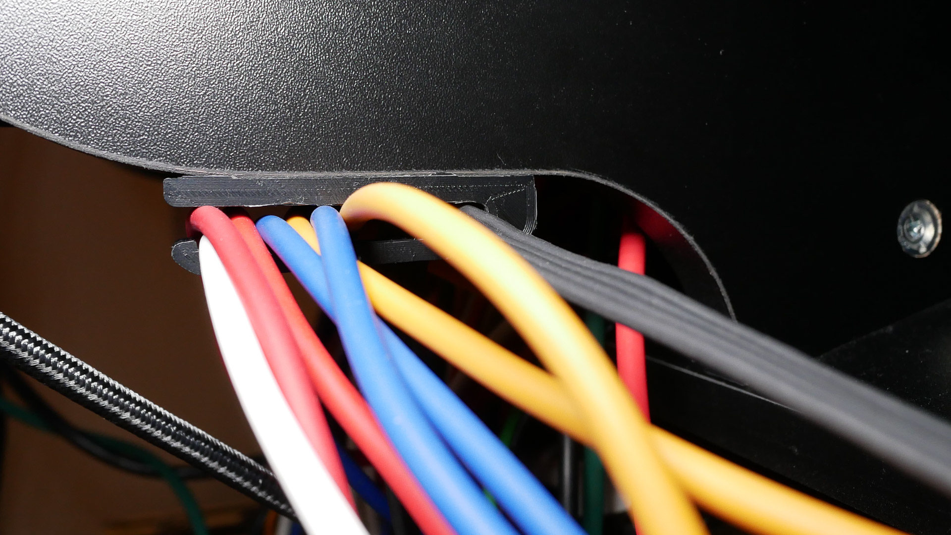 Auf der Rückseite gibt es fest montierte Klett-Bänder, durch die man die Kabel führen kann. Man kann damit aber auch eine Steckdosenleiste fixieren. Hier bietet es sich allerdings an, anschraubbare Steckdosenleisten zu montieren. Zudem habe ich mir Kabelführungen konstruiert und mit dem 3D-Drucker hergestellt. Durch diese kann ich Signal- und Stromleitungen getrennt voneinander führen und es trägt etwas zur Übersichtlichkeit bei.